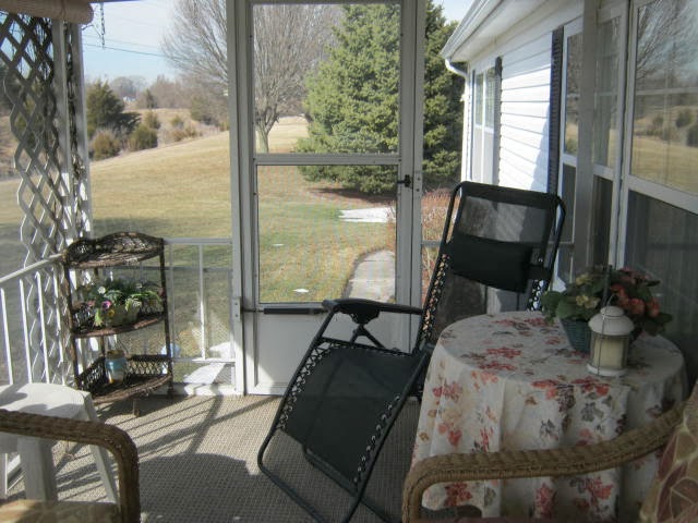 Today, after one of the longest and hardest winters we can remember, temperatures reached 50 degrees and the sun shone brightly. Because we were absolutely starved for some outdoor porch time, Don set up all outdoor furniture on the screened-in porch. Don, Frank-the-Cat, and I tested the waters, or, in this case, poked our noses out the door. And, what do you know, it was very nice and warm in the sunshine.